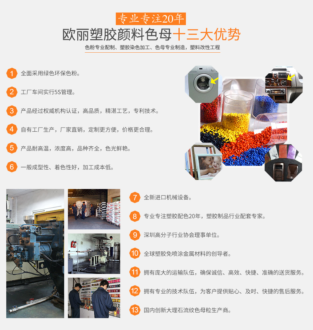 “深圳市歐麗塑膠原材料有限公司”創(chuàng)辦于上世紀90年代初,經過20多年的不斷發(fā)展壯大,已經成為色母粒、色母料、黑色母粒等塑料色母粒領先的色母粒廠家,更是塑膠制品行業的報務精英。
